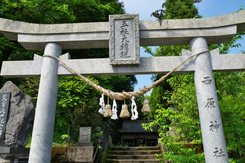 鳥居扁額に「三社大権現」、銘に「西原神社」とあります。